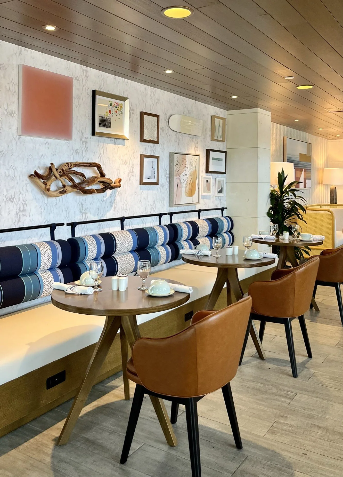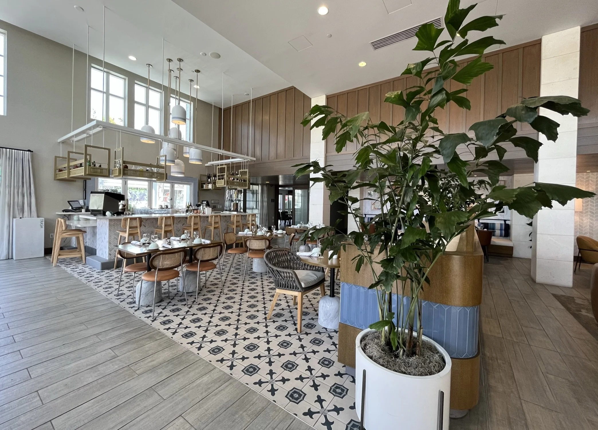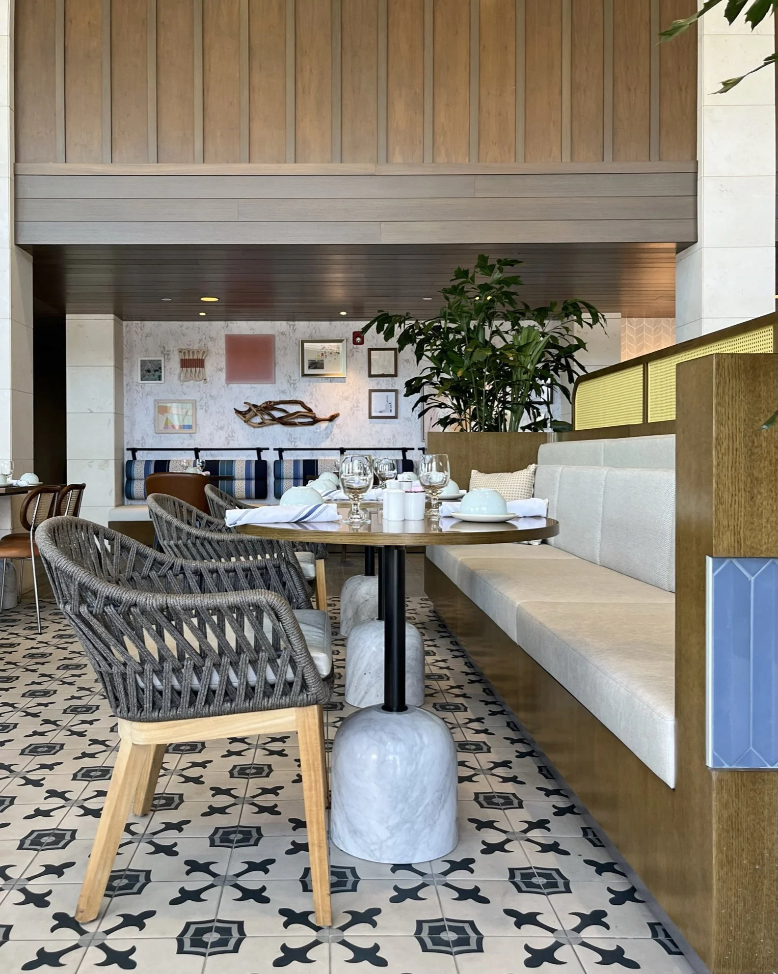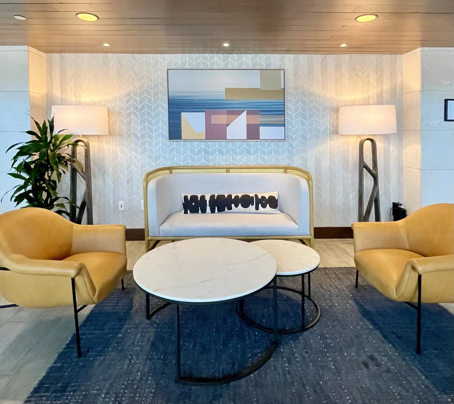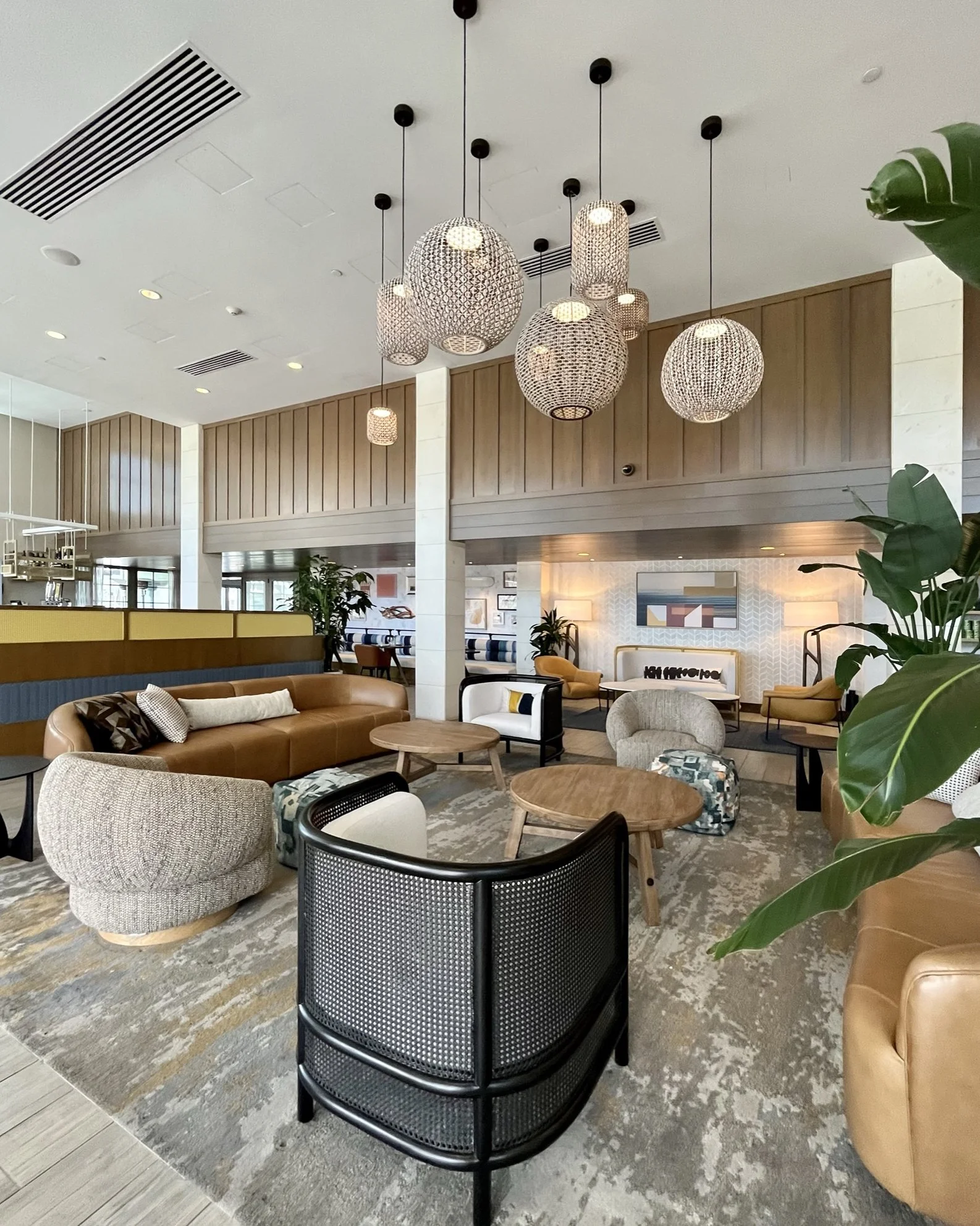 Unexpected details are used throughout. Basket-like textures are used as an accent on furniture and overhead pendants. The mood is casual, upscale, and elegant. The line between inside and out is blurred, with colorful area rugs and artisan tiles delineating intimate lounge and seating areas within the two-story lobby space. The feature bar opens directly onto the outside bar patio with a large pass-through window. A floating overhead open trellis structure with cascading plants bring nature indoors. The front desk is the anchor of the lobby space, with a stunning large slab of natural white marble with blue veins providing the backdrop and mercury glass pendants hanging in front. Artwork is collected and curated, featuring coastal imagery and artifacts.